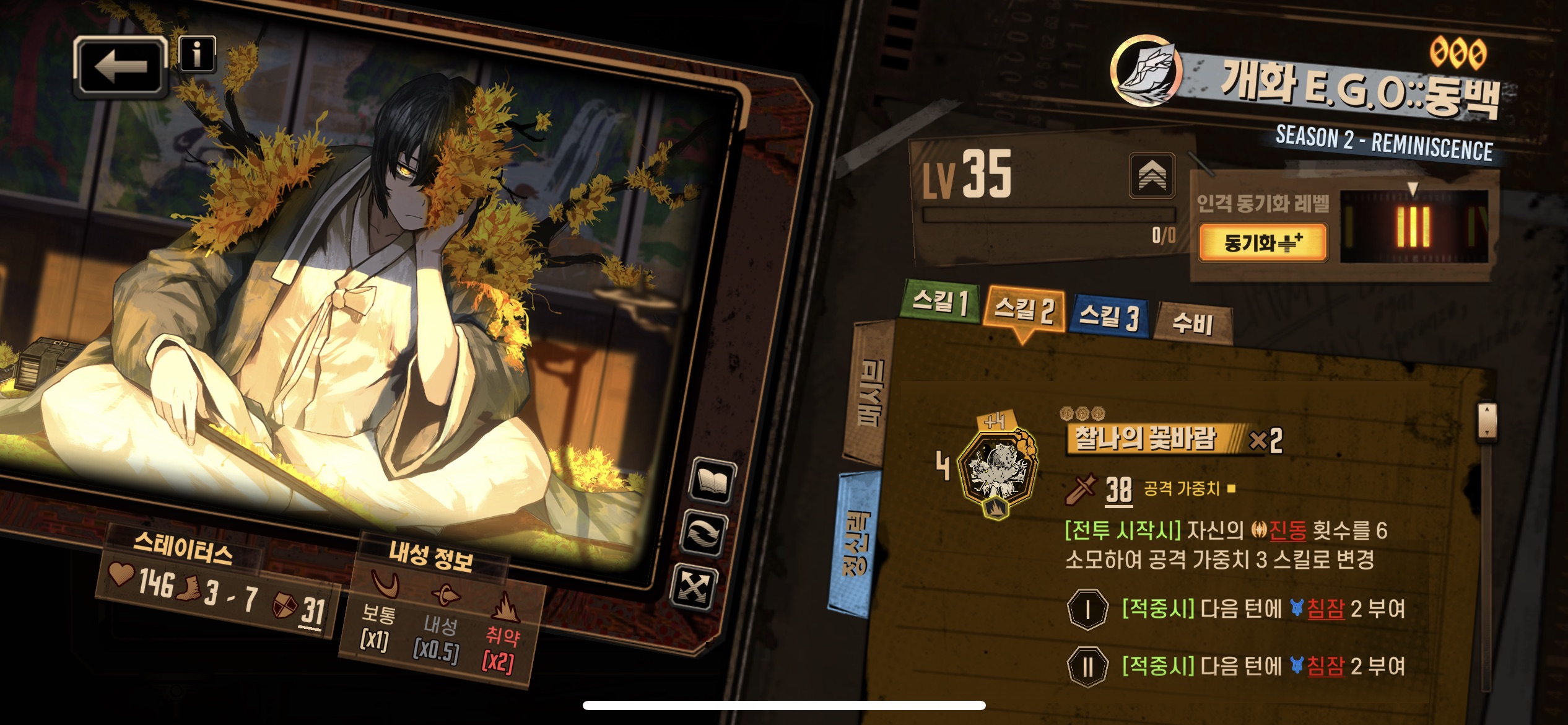 2스킬 : 전투시작시 메인타겟의 침잠횟수가 6이상이면 코인 위력 +1 추가