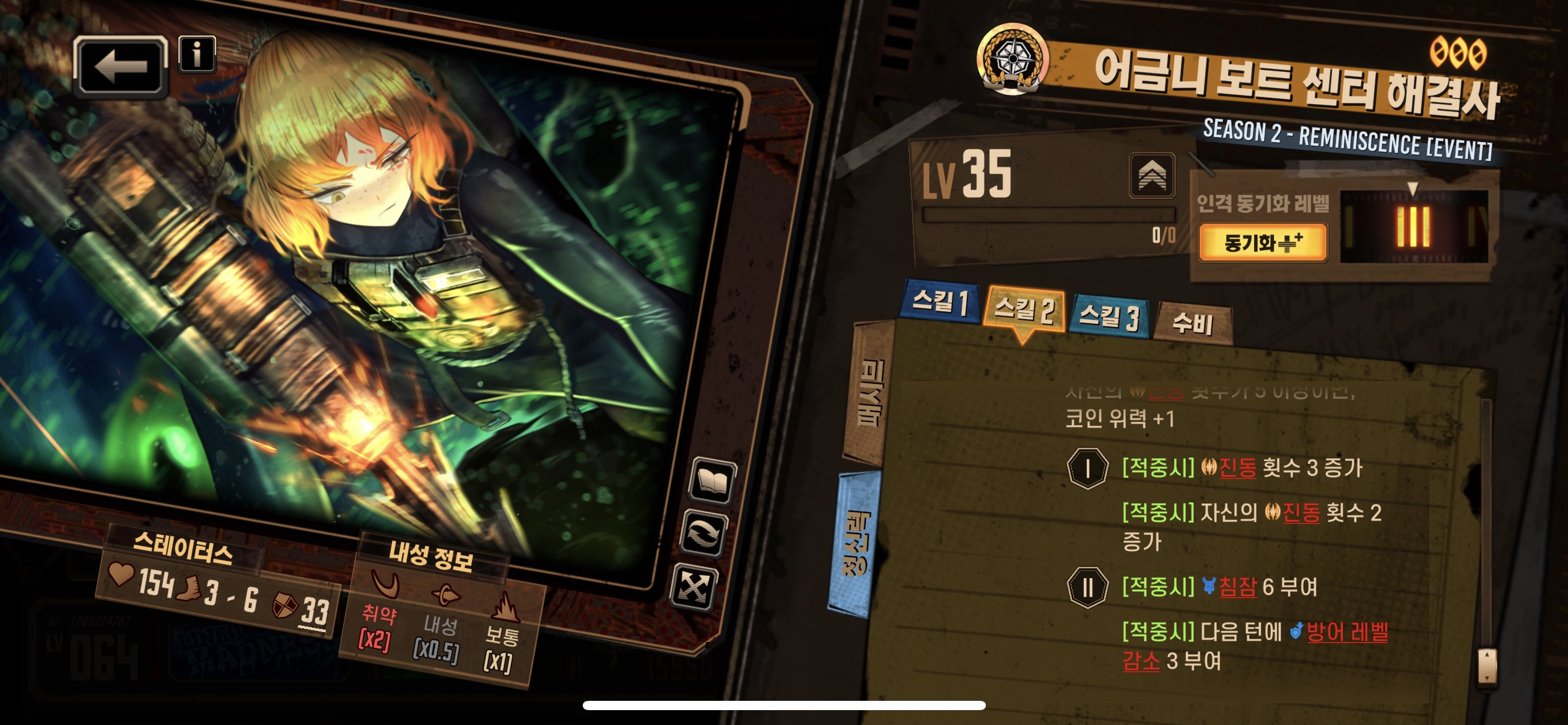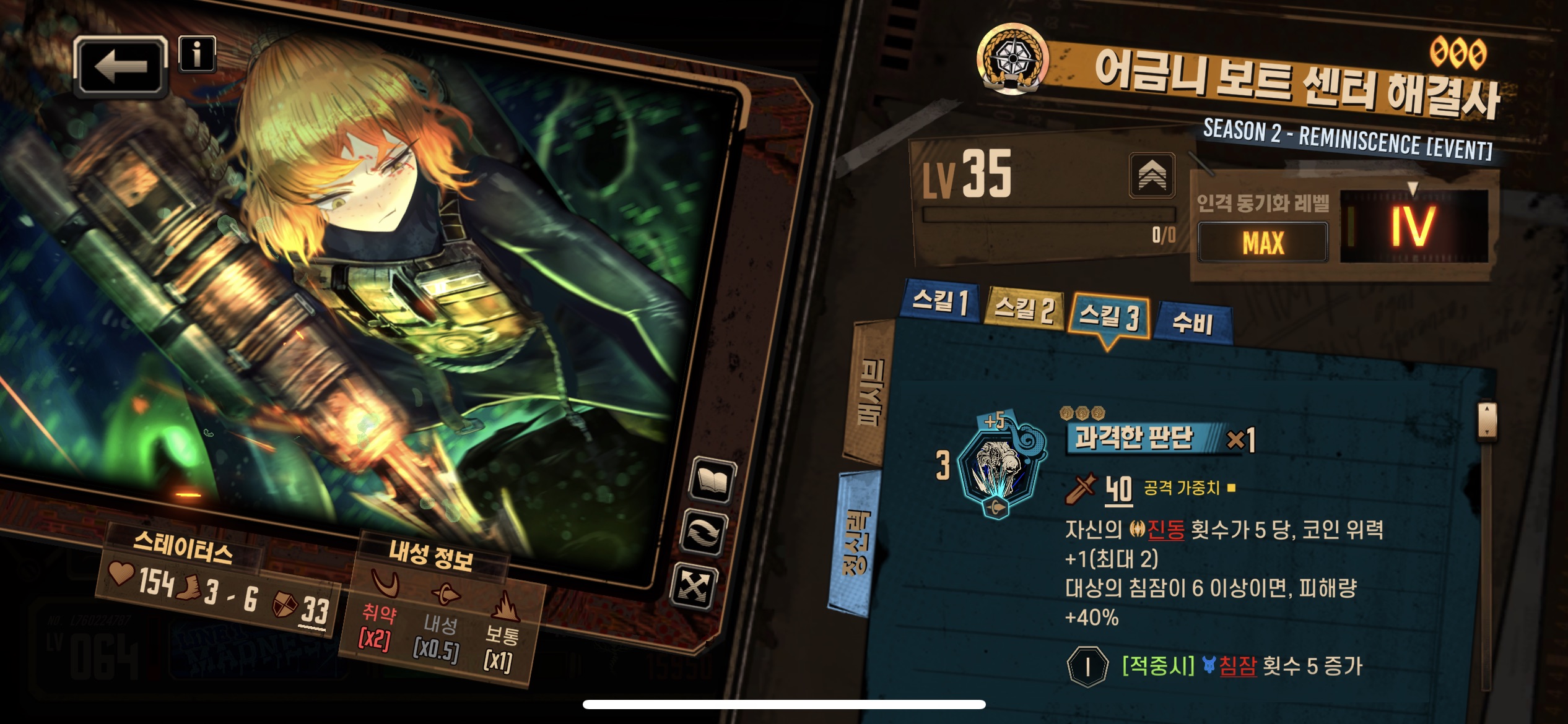 3스킬 : 기본효과에서 진동 횟수가 5 이상 코인위력+1 -> 5당 코인위력 +1 (최대 2) / 대상의 침잠 6이상이면 피해량 40% 증가