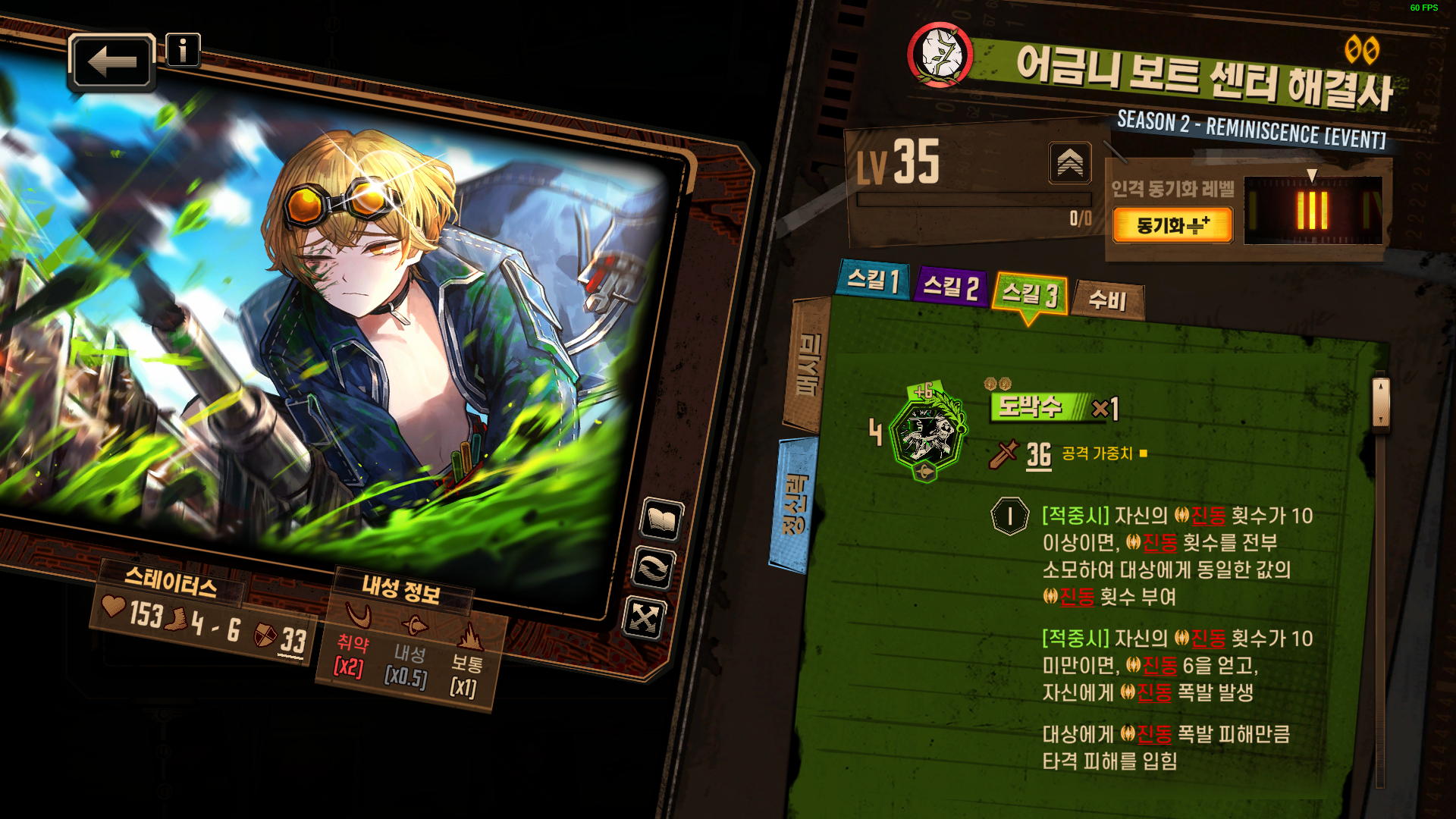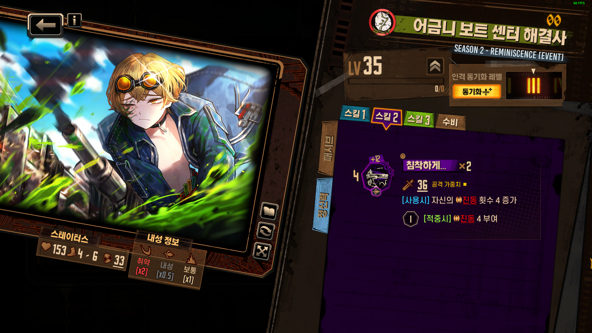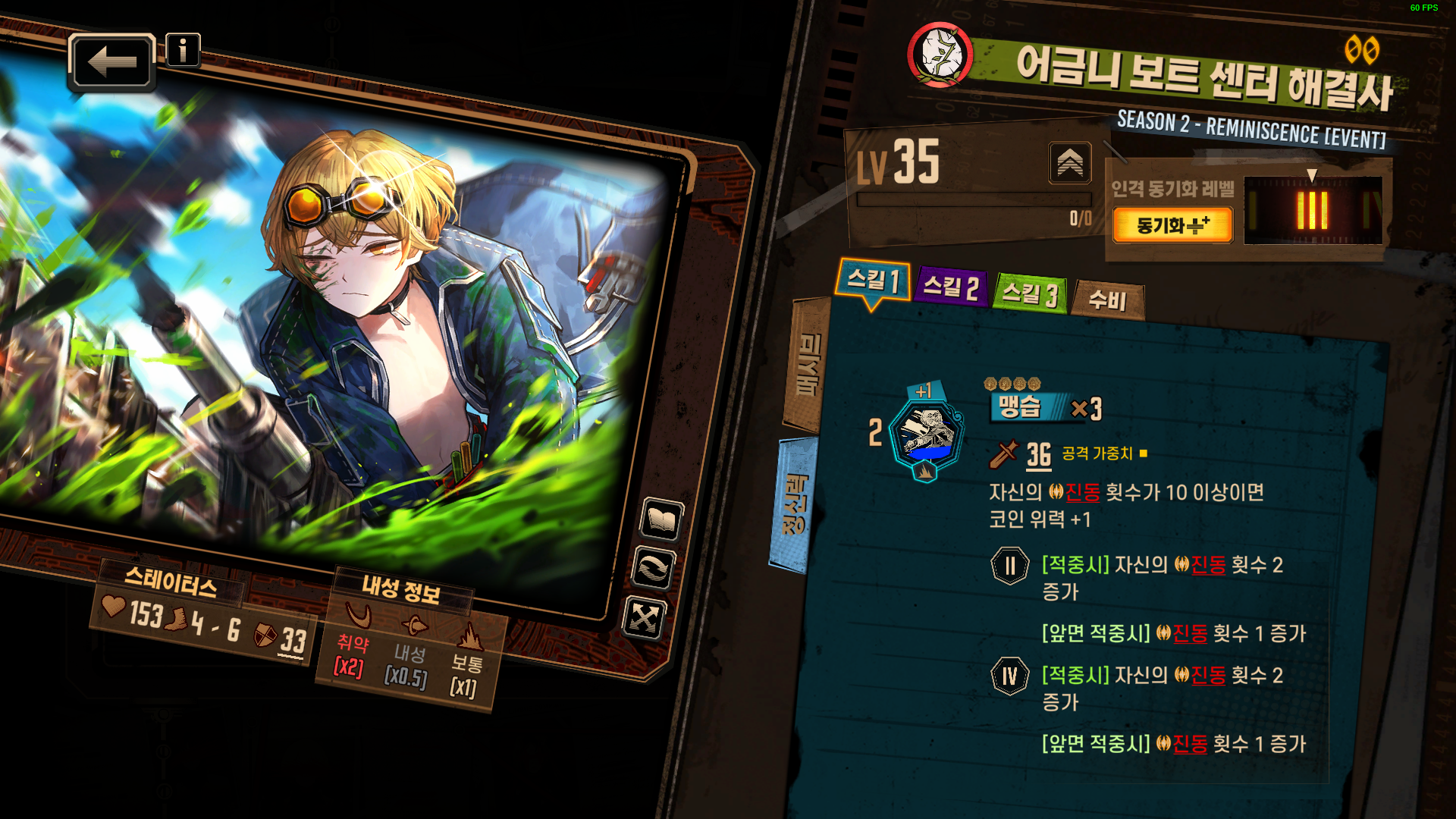 1스킬 : 자신의 진동 횟수가 10 이상이면 코인 위력 +1 추가 / 1타, 2타 - 적중시 상대 진동 횟수 1 증가 추가