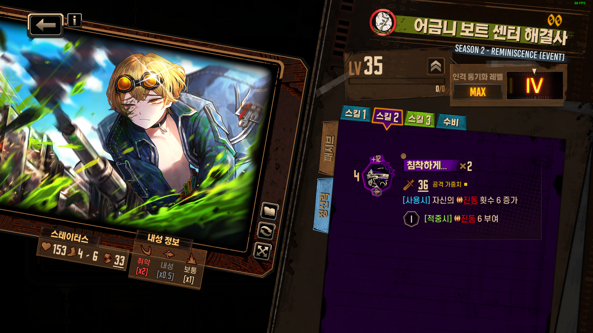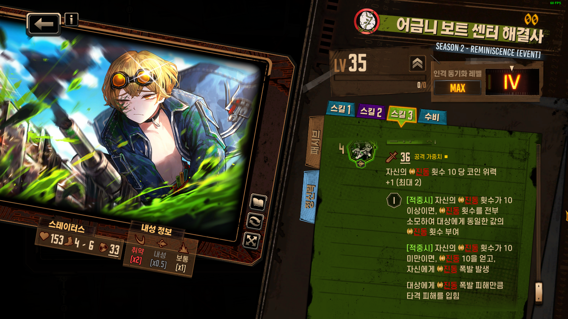 3스킬 : 자신의 진동 횟수 10 당 코인 위력 +1 (최대 2) / 1타 진동횟수 10 미만일때 진동 6 -> 10 얻음