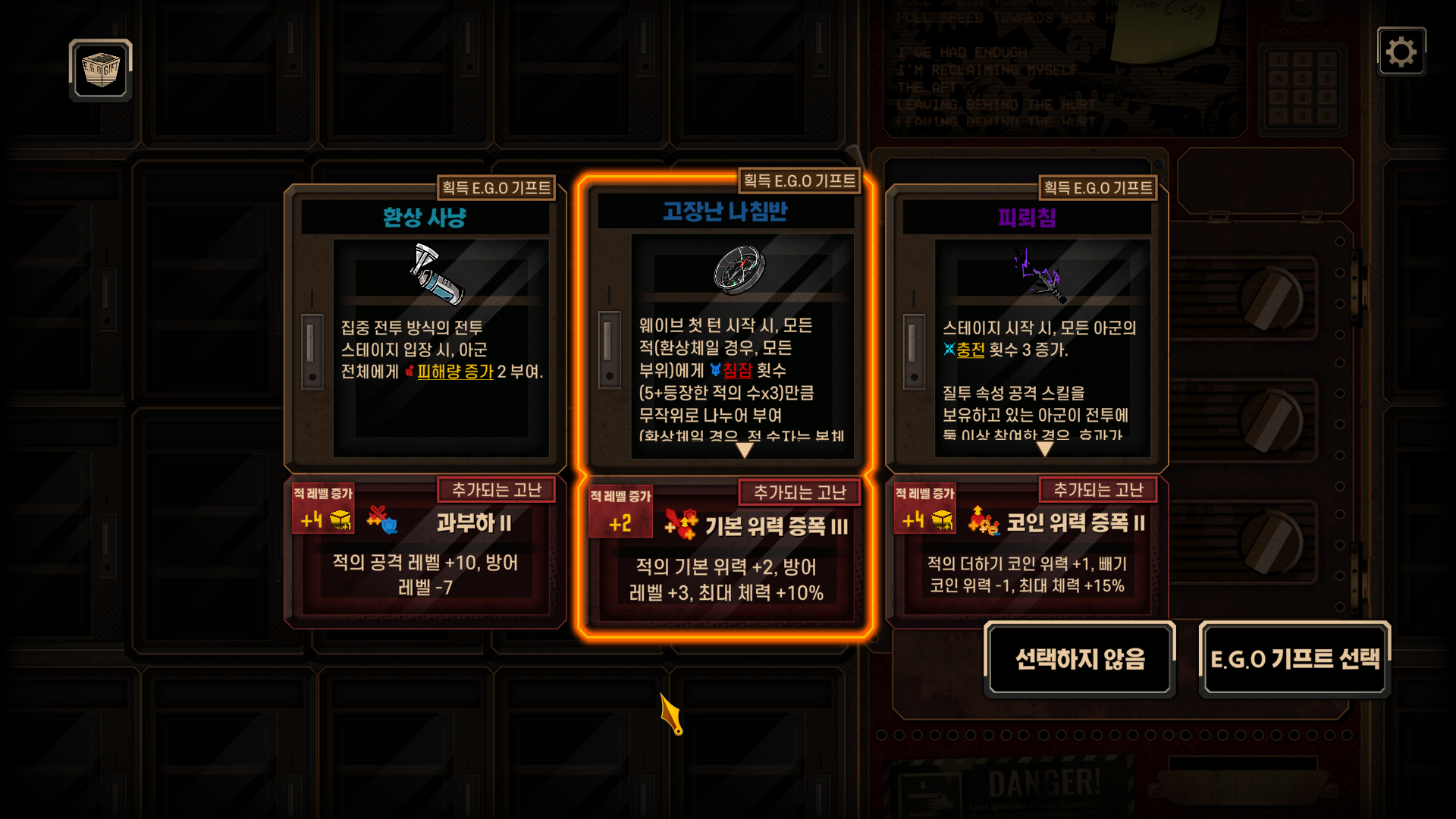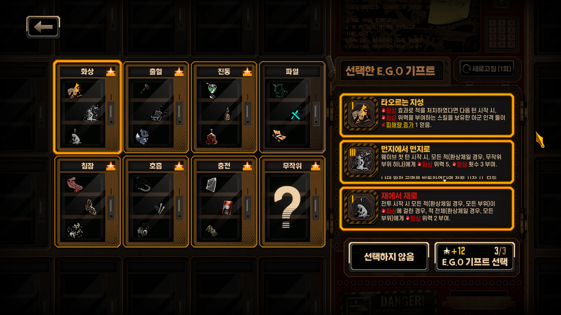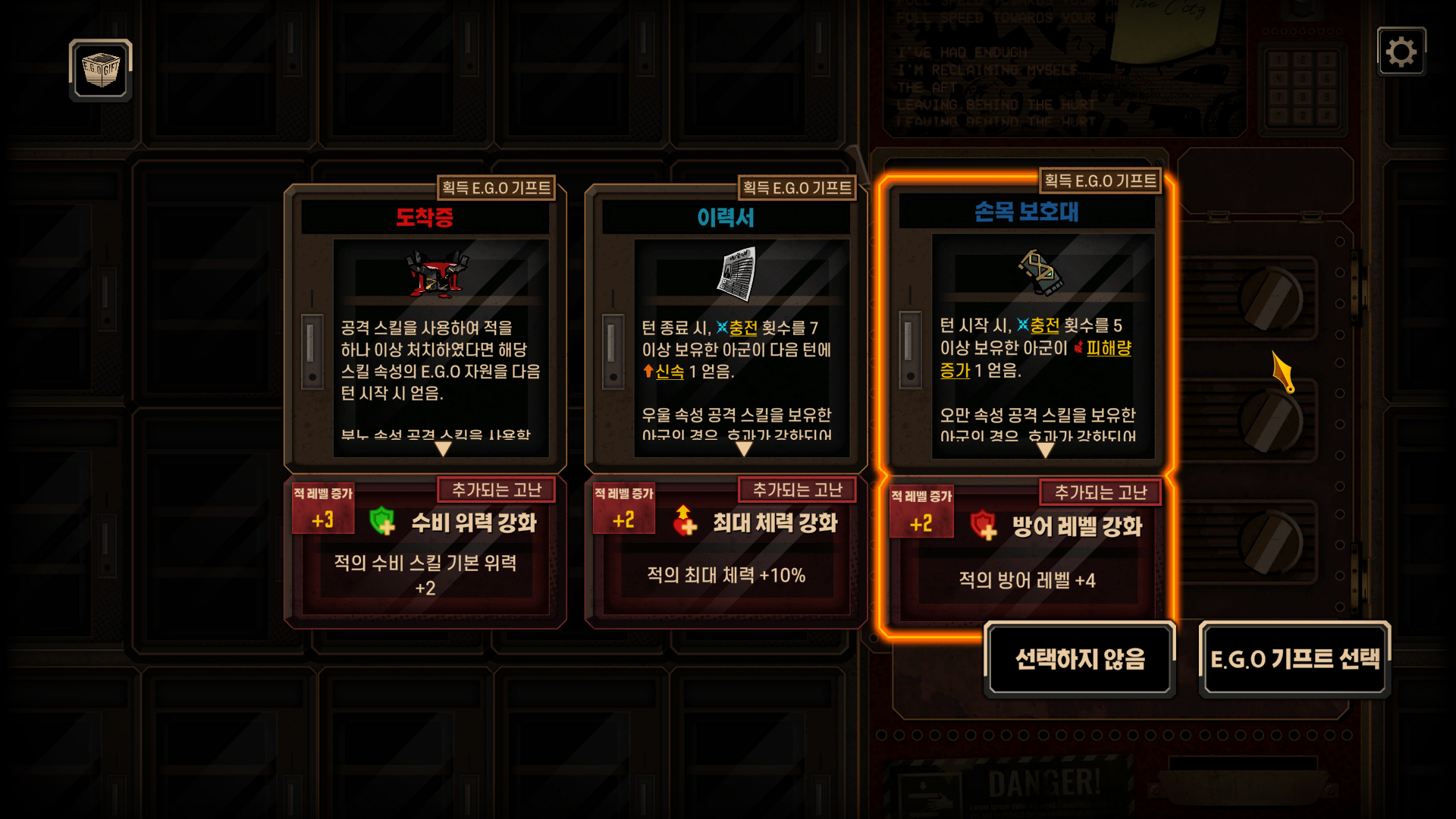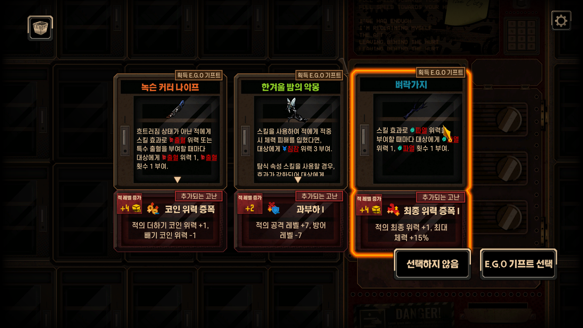 체력회복계열 기프트 1개 or 에고자원수급 기프트 1개 or 화상 기프트 1개를 선택해주자