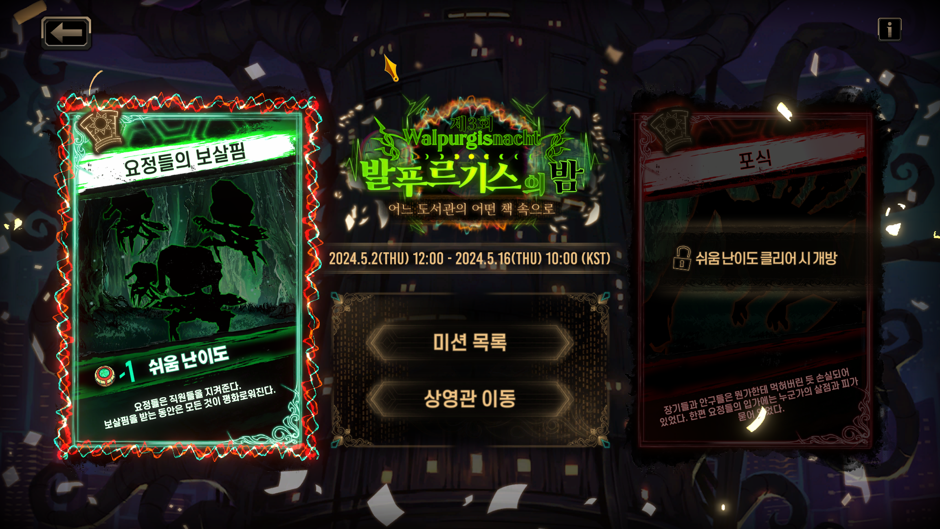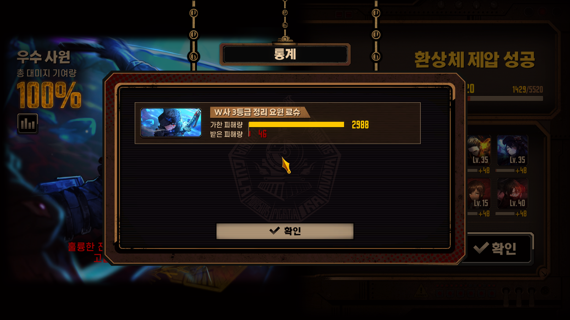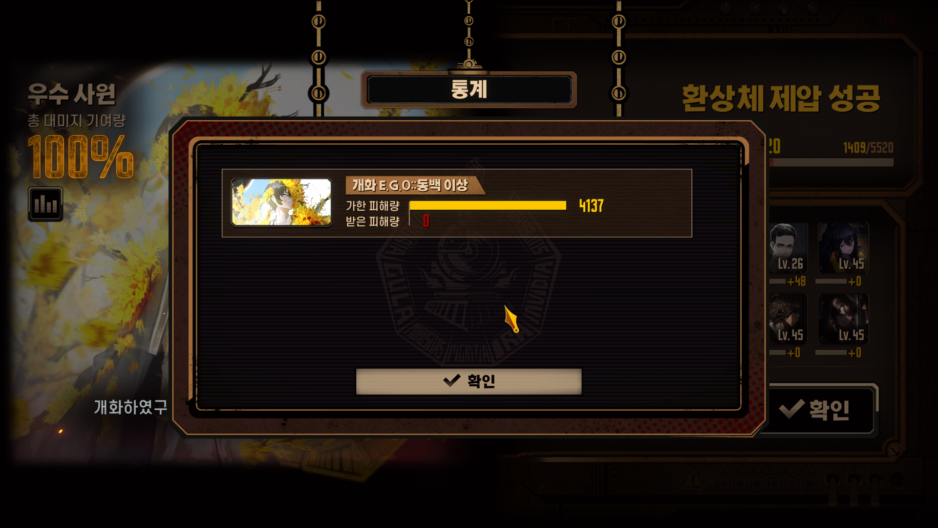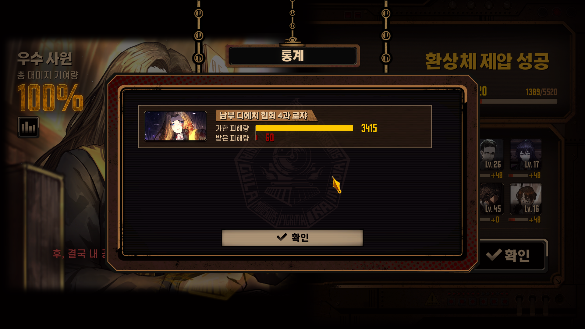 역사의 층 사서가 적에게 피해를 5회 미만으로 받고 생존한 상태로 제압 성공