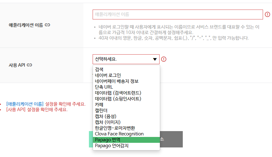 사용할 Papago 번역을 눌러주고, 애플리케이션 이름을 적어준다. (필자는 번역기 라고 적었다)